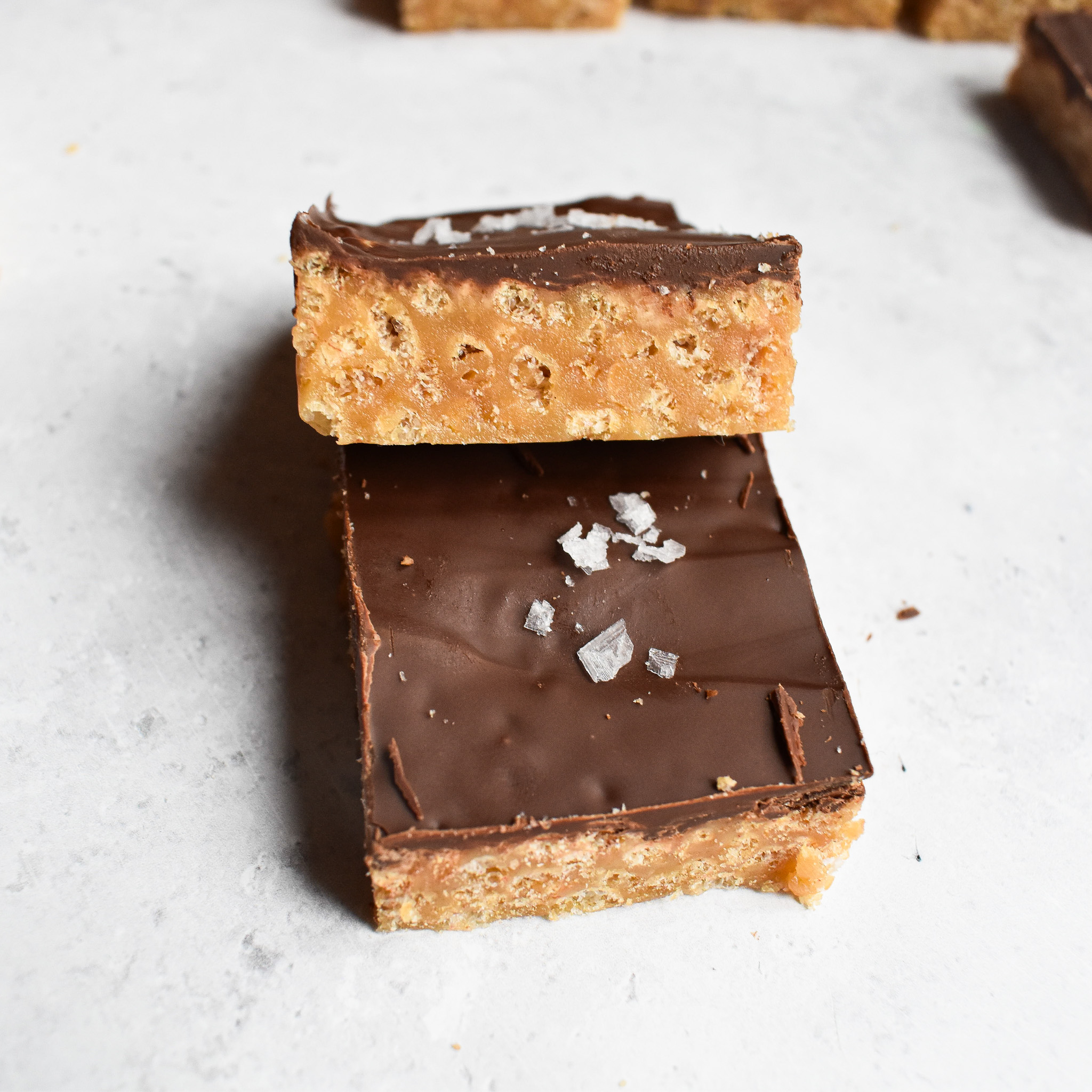 The combination of chocolate and caramel go so well together and also go great with the chewy crispy texture of the treats. I also top the chocolate with some sea salt flakes which also gives these caramel rice krispie treats a lovely flavour.