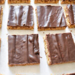 These chocolate oat bars are super easy to make and best of all, they only require a few simple ingredients. The recipe is super quick and provides the perfect balance of oats and chocolate. The bars have a thin oat layer with a thin layer of chocolate and they go perfectly with a cup of tea or coffee. They’re wholesome yet indulgent and the chewy oat base pairs nicely with the smooth dark chocolate layer.