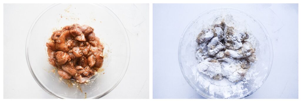 - Pour the marinade onto the chicken and mix well to coat all the chicken. Cover and store in the fridge for 30 minutes. Remove the chicken from the fridge and add the egg white. Mix the egg white into the chicken then sprinkle on the cornflour. Mix the cornflour into the chicken and ensure all the chicken is coated well with cornflour.