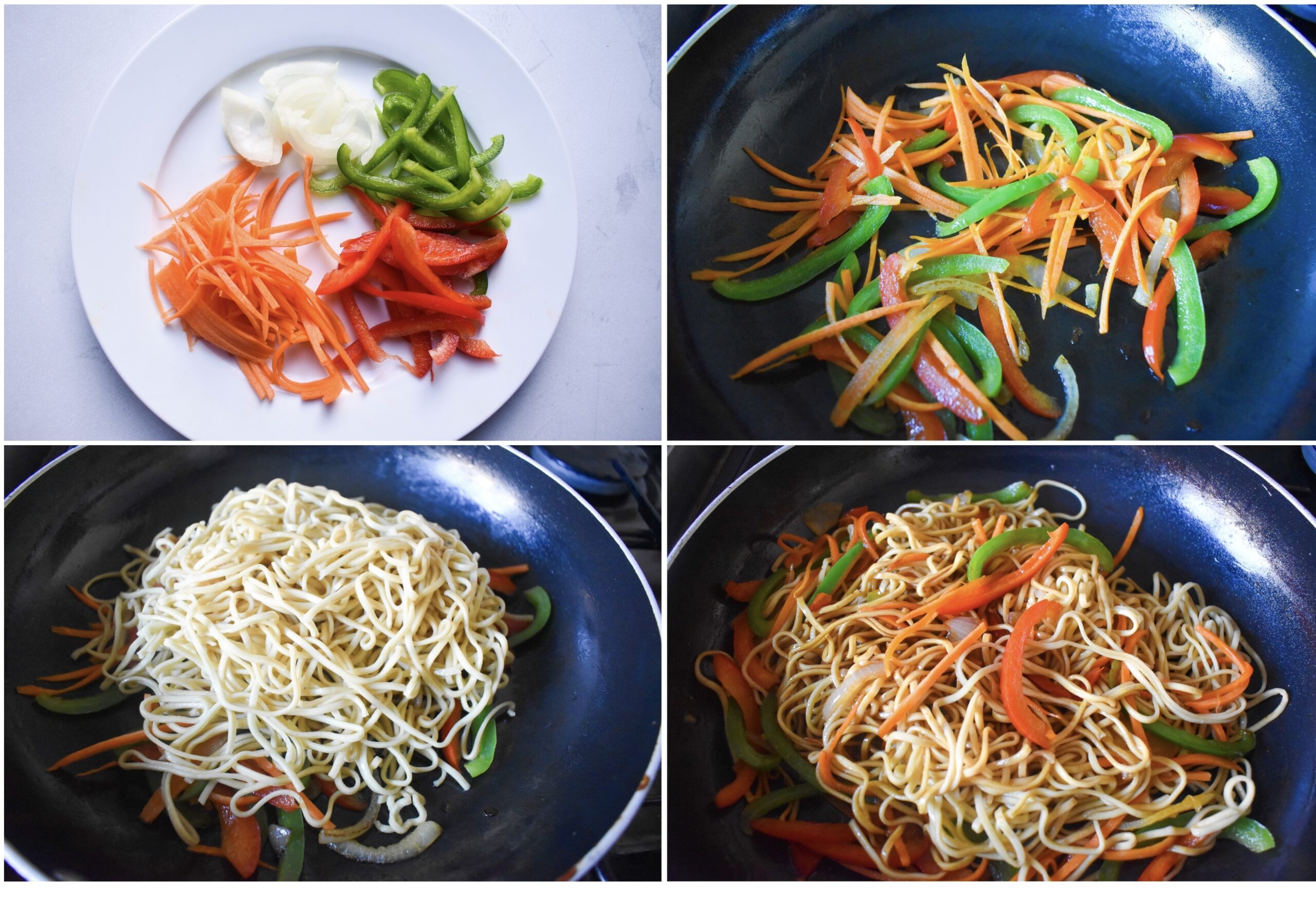 - Place a non-stick frying pan on a medium to high heat and add the oil. Add in the onions, red peppers and green peppers then cook for 2 minutes. Add in the julienne carrots then toss in the cooked noodles and stir fry for 1 minute. Pour in the soy sauce, oyster sauce and mix until combined. Remove from the heat and serve the noodles with the crispy sweet chilli chicken.
