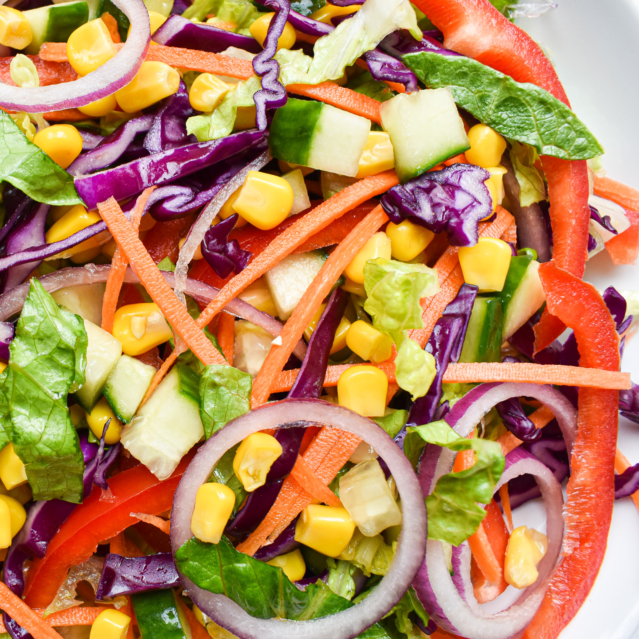 - Start by washing all the salad ingredients then use some kitchen towel to dry them. Finely slice the romaine, red cabbage, bell pepper and red onion then dice the cucumber. Add them all to a large salad bowl. If you have a julienne peeler, cut the carrots into strips or use a knife to cut them into thin strips and add to the salad along with the sweetcorn.