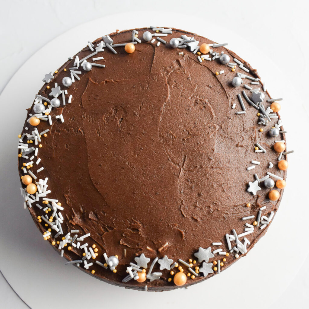 If like me you love chocolate then you will love this mini 6 inch double chocolate cake recipe. The soft, moist chocolate cake is covered in a chocolate buttercream and decorated with simple sprinkles.