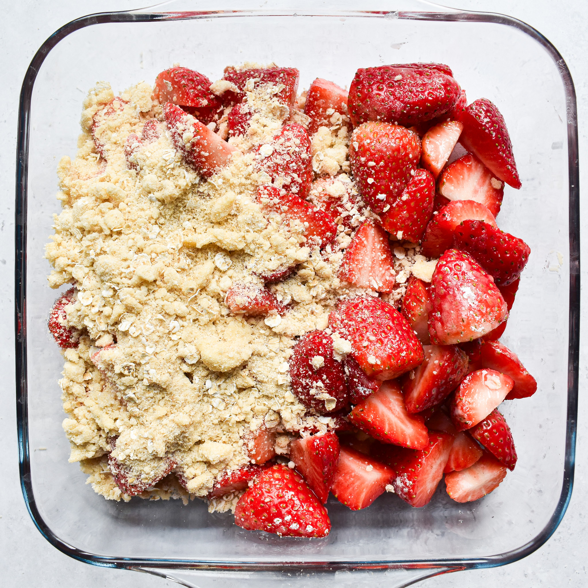 - Add the flour to a bowl along with the butter. Use your fingers and rub the butter into the flour until you have peas size pieces of butter. You can use a pastry cutter or food processor if you’d prefer not to use your hands. You can even do this with a fork. To the flour and butter mixture, add the oats, soft brown sugar, granulated sugar and salt and then combine. Sprinkle the topping onto the strawberries and evenly spread. The strawberries will still release more juice so ensure you leave a gap around the edge of the baking dish so some of the liquid can evaporate.