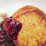 - Heat a large non-stick frying pan on a medium heat and add the butter. While the butter is melting, dip a slice of the brioche bread into the wet mixture by laying it flat. Turn the bread over to soak the other side then place the bread in the frying pan. Repeat the process with the other slice of bread. Cook for 3 minutes then use a spatula to turn the bread onto the other side and cook for another 3 minutes. Both sides should be golden brown. Serve with the berry compote.