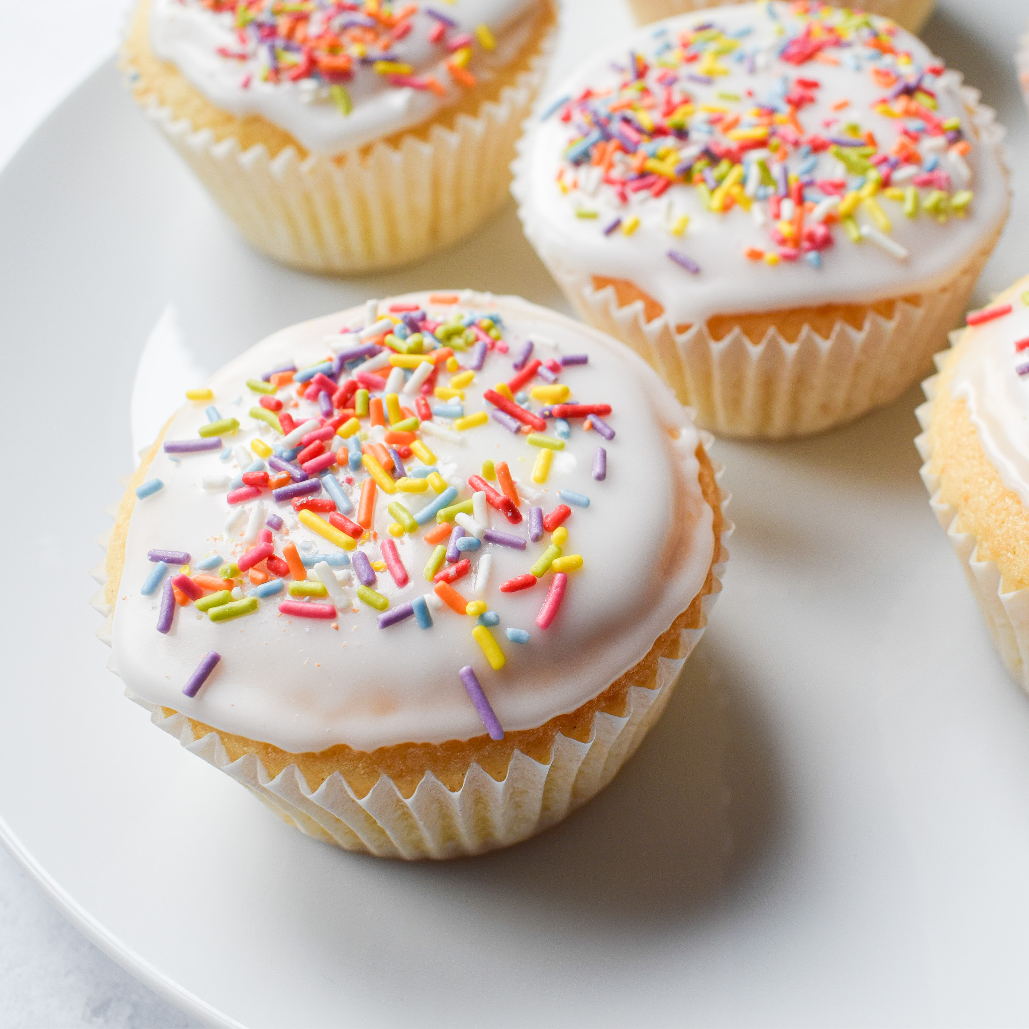 This recipe makes a small batch of glazed vanilla cupcakes also known as fairy cakes. These cupcakes are glazed with icing sugar and topped with sprinkles which makes them so pretty.