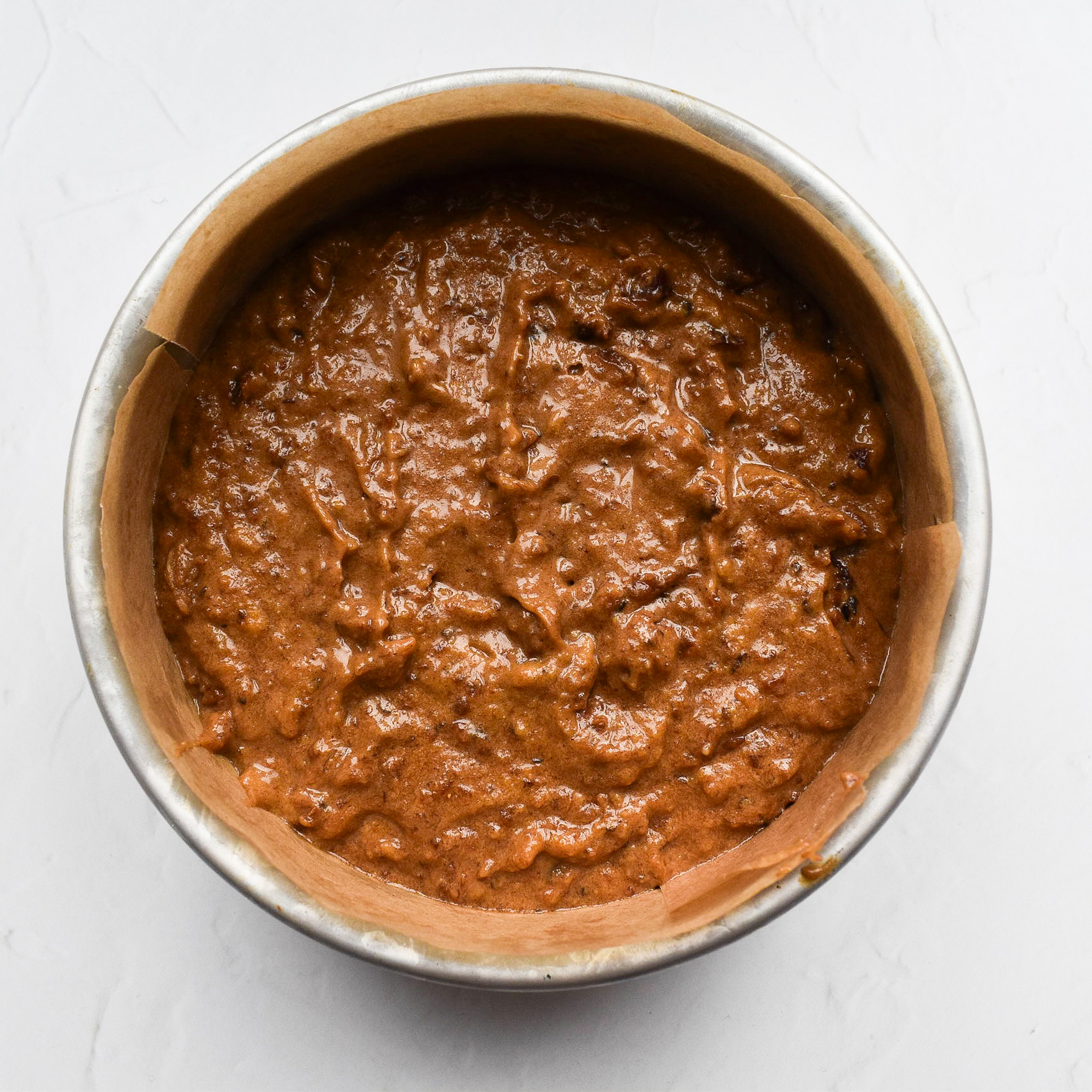 2. Preheat the oven to gas mark 1/275oF/140oC/120oC fan and line a 6-inch/15cm round cake tin with parchment paper. Ensure the tin is at least 3 inches deep. Set the tin aside.