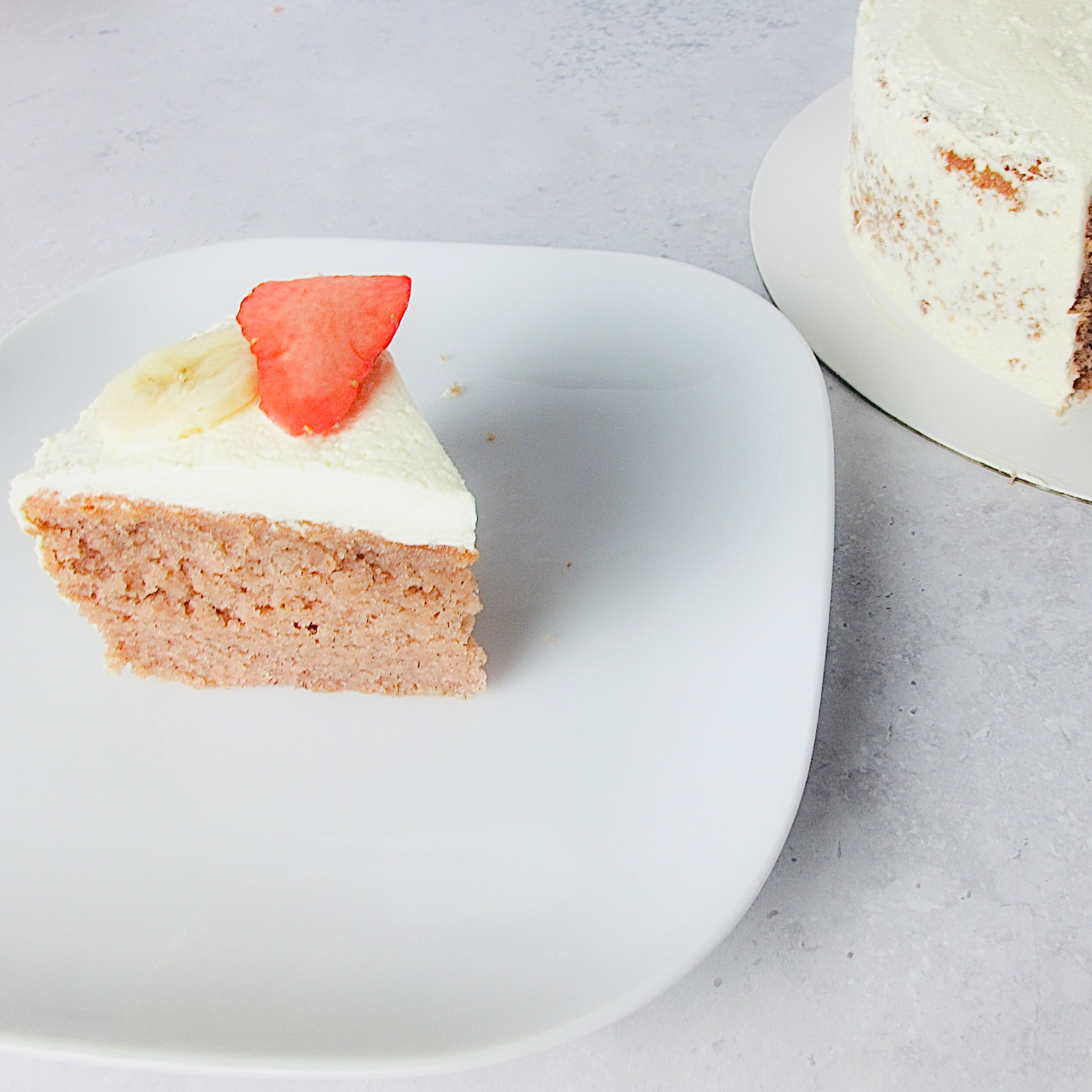 This recipe makes a strawberry banana cake that is soft, moist and fluffy. The cake is made with blended bananas and a strawberry reduction to produce a smooth fruity flavoured cake. It is then topped with a whipped cream frosting.