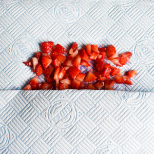 - Chop the strawberries into small bite size pieces then add them to a bowl with 1 tablespoon of granulated sugar. Cover the bowl and set aside for 1 hour. This is to remove the majority of water from the strawberries so your blondies don’t come out soggy.