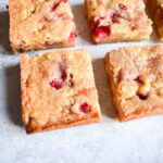 This recipe makes a batch of fudgy strawberry white chocolate blondies that are perfect to serve as a sweet breakfast or an after-dinner treat. These strawberry blondies are full of delicious fresh strawberries that go perfectly with the creamy white chocolate.