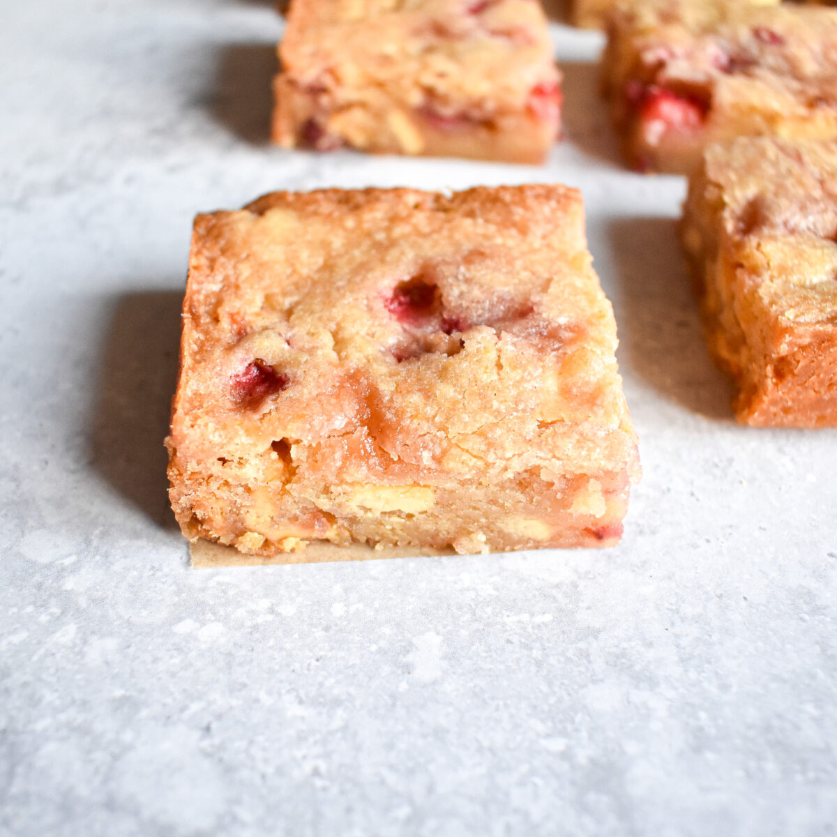 This recipe makes strawberry white chocolate blondies that are soft and chewy with a super fudgy texture which are very similar to brownies. To achieve this, no raising agent is used as using raising agents will give the blondies a cake like texture rather than a brownie texture.