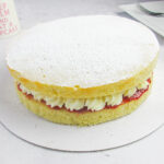 Take one of the cakes and spread the jam evenly over the top of it then pipe the whipped cream on top of the jam. I usually pipe around the outside of the cake then fill in the middle. You can also just spread the whipped cream with a palette knife. Place the second cake on top and dust the top with some icing sugar. Time to enjoy.